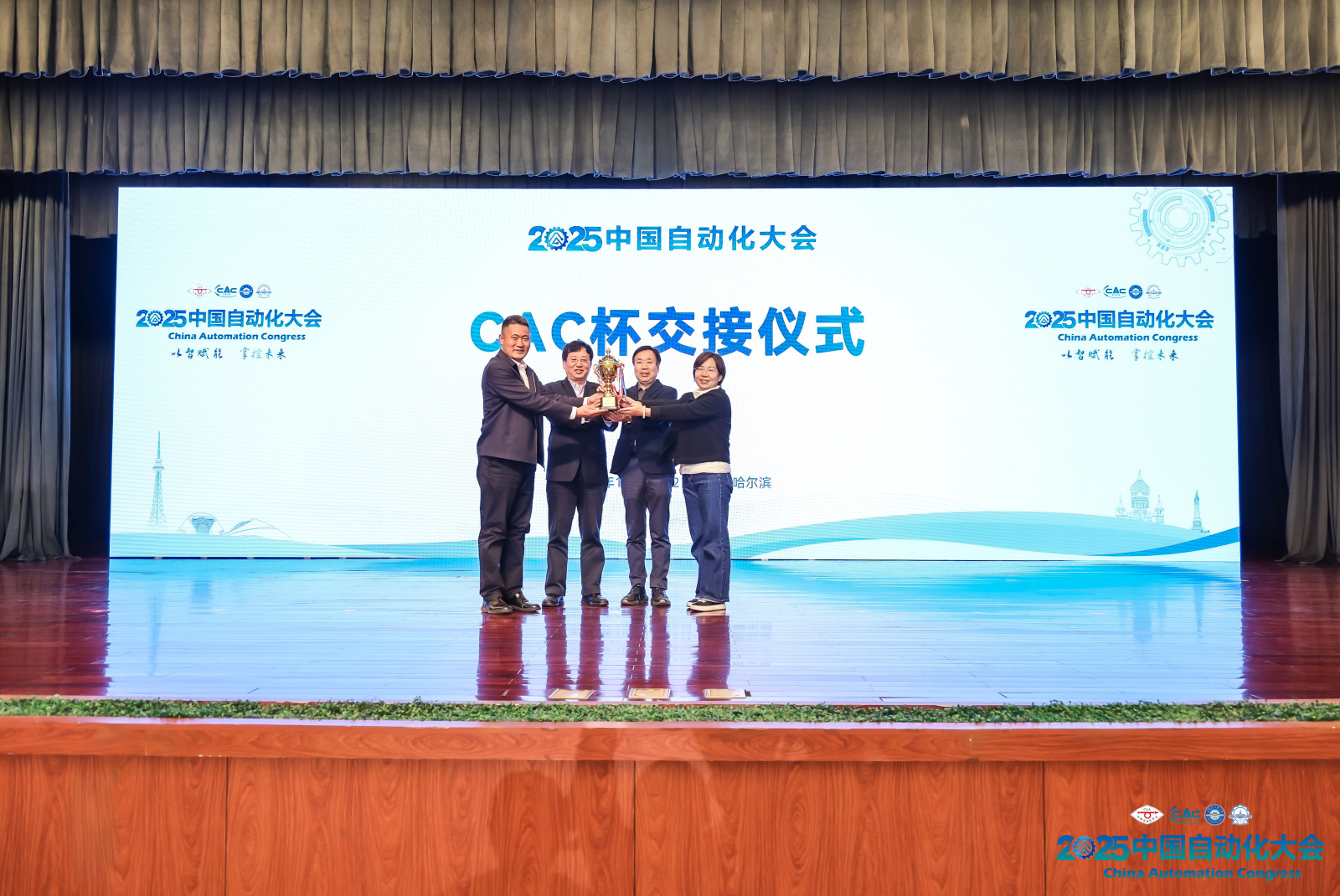 大会同期进行了“CAC杯”交接仪式,2025中国自动化大会承办单位代表——哈尔滨工业大学副校长沈毅和哈尔滨工程大学智能科学与工程学院院长蔡成涛共同将象征着传承与责任的“CAC杯”郑重转交给2026中国自动化大会组委会代表——副理事长侯增广与秘书长张楠。