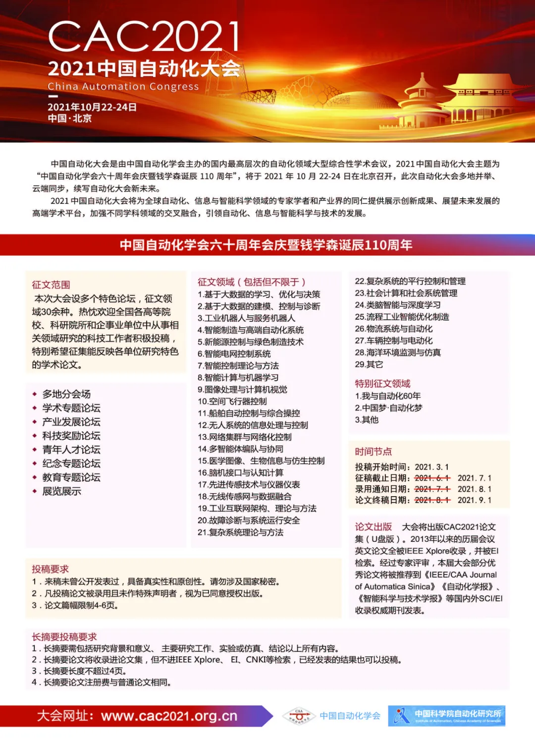 大会将出版CAC2021论文集(U盘版)。2013年以来的历届会议英文论文全被IEEE Xplore收录,并被EI检索。经过专家评审,本届大会部分优秀论文将被推荐到《IEEE/CAA Journal of Automatica Sinica》《自动化学报》《智能科学与技术学报》等国内外SCI/EI收录权威期刊发表。